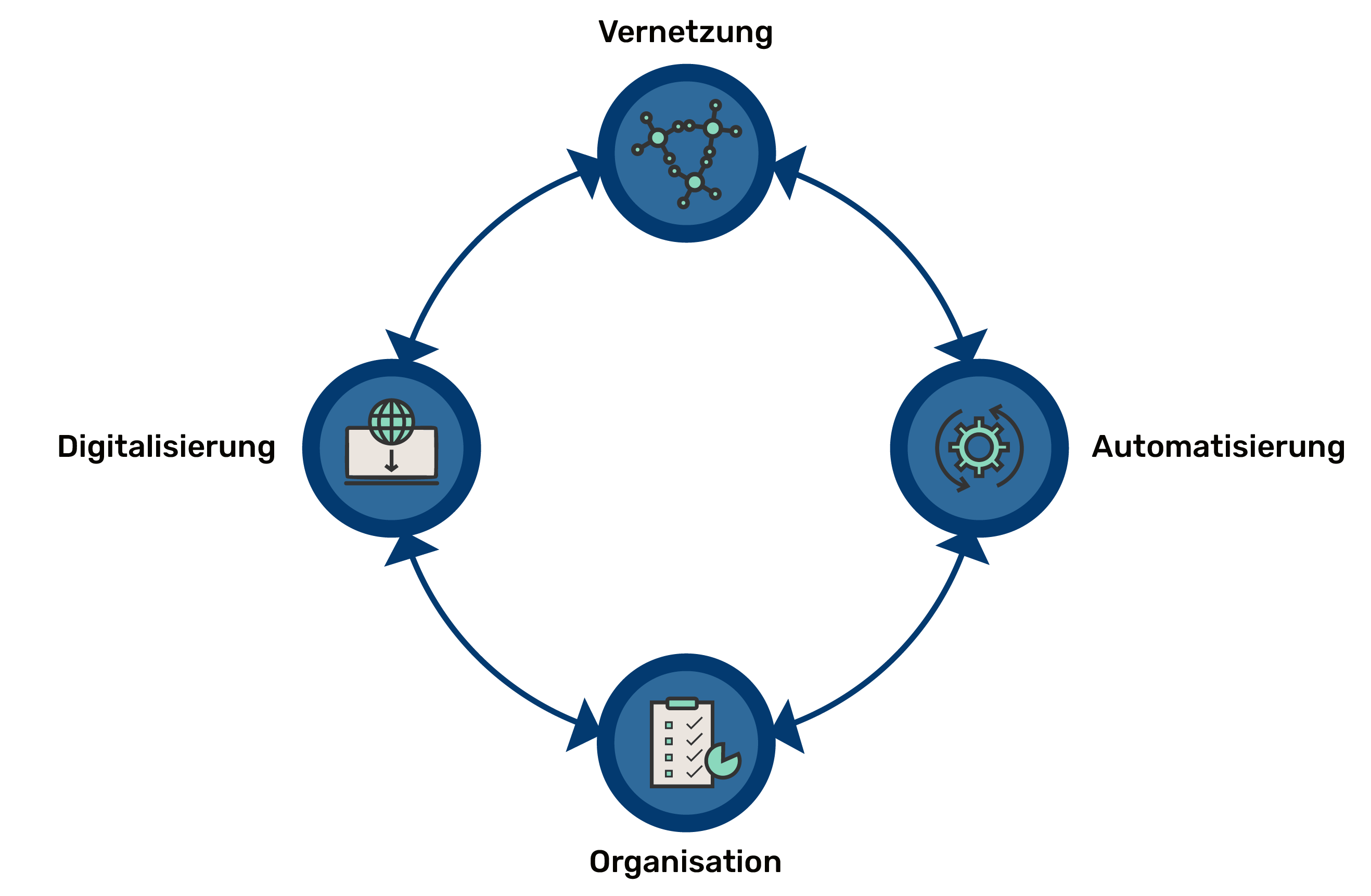 Daten werden unter Verwendung sogenannter Cyber-Physischer Systeme (CPS) generiert. Moderne Maschinen sind mit einer Vielzahl an Sensoren ausgestattet, die diverse Parameter messen und diese über die digitalisierte Unternehmensstruktur zur Verarbeitung weitergeben – ganz ähnlich also wie das sensorische Nervensystem beim Menschen. Damit wird klar, dass Digitalisierung allein noch keinen Einfluss auf die Abläufe in einer Produktionsanlage haben kann – Die Verwertung des gewonnenen Materials ist ausschlaggebend. Jene Verwertung findet im Rahmen der Organisation von Abläufen, der Automatisierung der Fertigung und der Vernetzung von Maschinen statt.